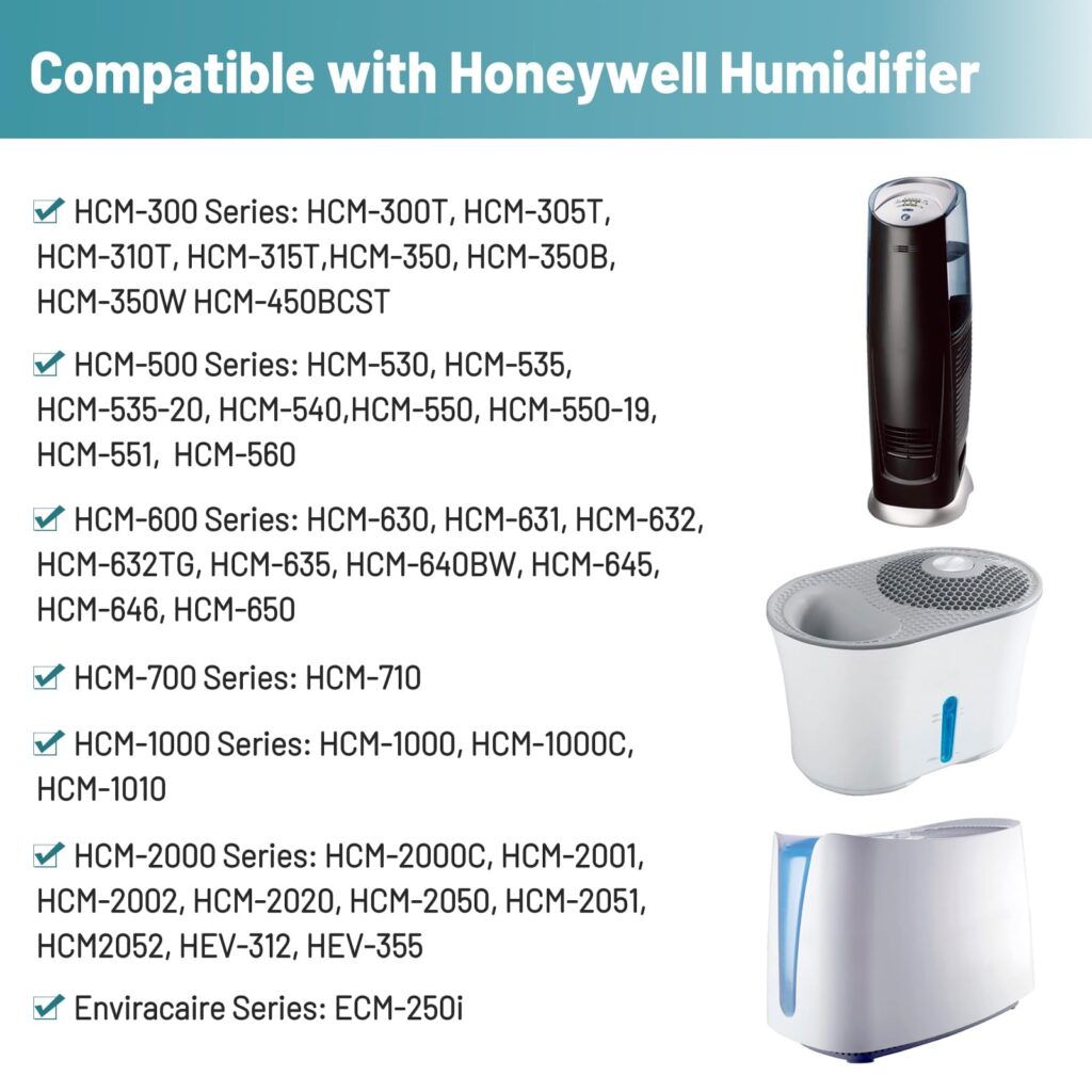 【Compatible Models】Our humidifier filters are compatible with honeywell HCM-350, HCM350, HCM350W, HCM-350B, HCM350B, HCM-350W, HCM-350B-CST, HCM-300, HCM-300T, HCM300T, HCM-305T, HCM310T, HCM-315T, HCM305BCST, HCM-450B-CST, HCM450BCST, HCM-500, HCM-530, HCM530, HCM-535, HCM353, HCM-535-20, HCM53520, HCM-540, HCM550, HCM-550-19, HCM55019, HCM-551, HCM-560, HCM560, HCM-600, HCM-630, HCM630, HCM-631, HCM631 humidifiers.